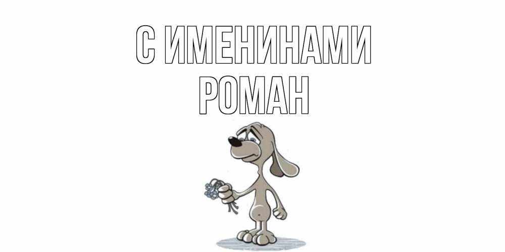 Открытка С именинами Роман. песик скучает и дарит цветы. я по тебе скучаю с песиком