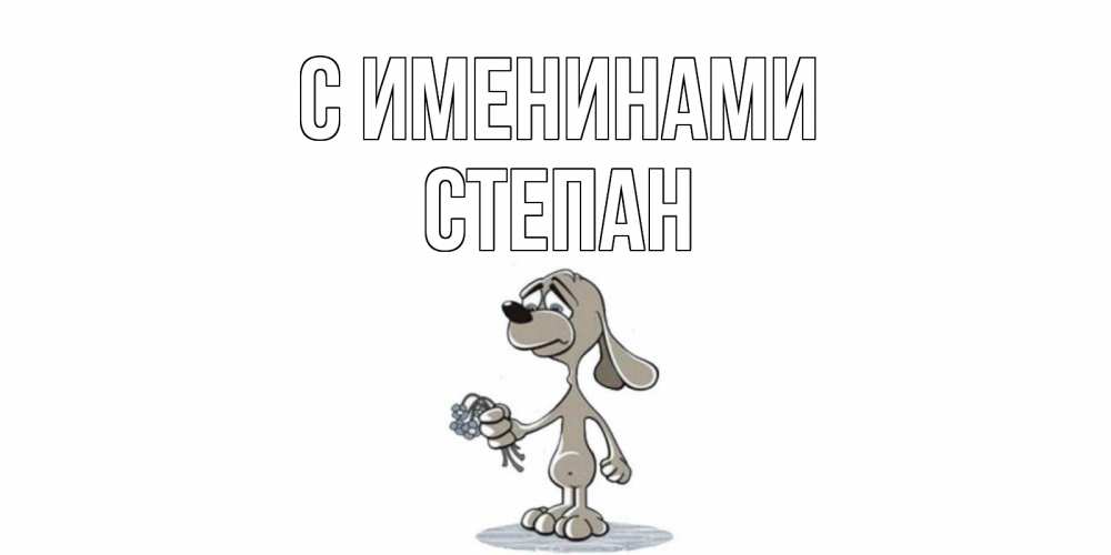 Открытка С именинами Степан. песик скучает и дарит цветы. я по тебе скучаю с песиком