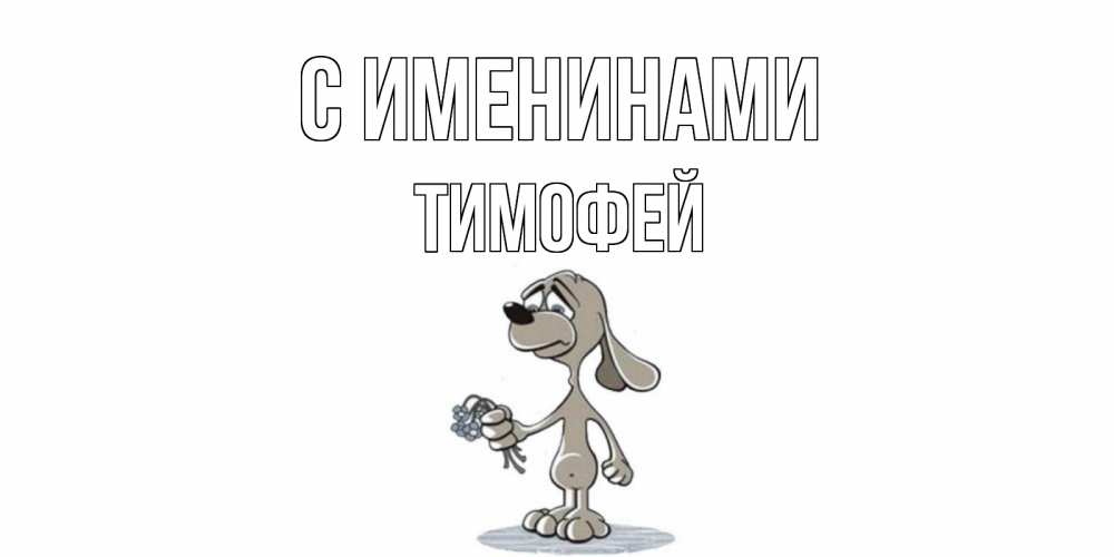 Открытка С именинами Тимофей. песик скучает и дарит цветы. я по тебе скучаю с песиком