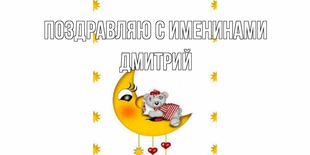 Открытка Поздравляю с именинами Дмитрий. Спокойной ночи мишка с сердечками на месяце. месяц, мишка