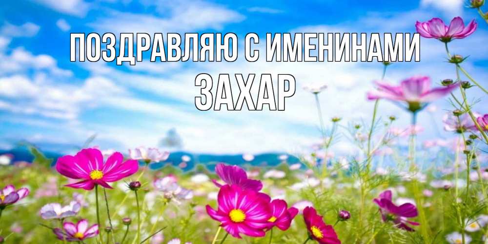 Открытка Поздравляю с именинами Захар. яркие полевые цветы на фоне голубого неба. поле цветов