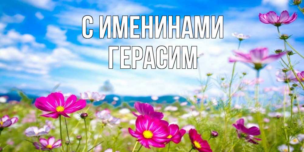 Открытка С именинами Герасим. яркие полевые цветы на фоне голубого неба. поле цветов