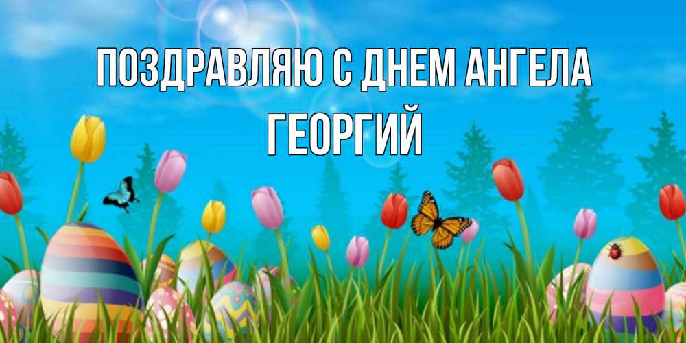 Открытка Поздравляю с днем Ангела Георгий. тюльпаны и радужные яйца. небо и тюльпаны с бабочкой