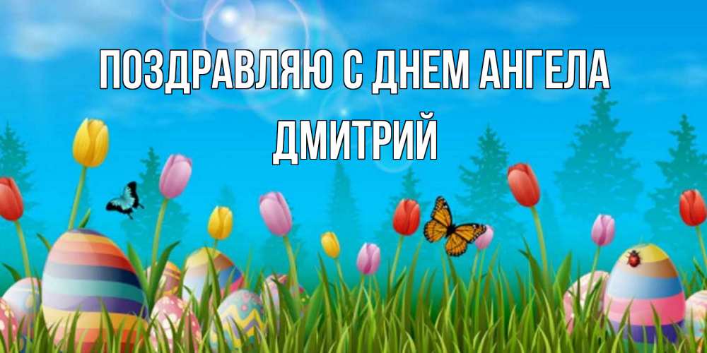 Открытка Поздравляю с днем Ангела Дмитрий. тюльпаны и радужные яйца. небо и тюльпаны с бабочкой