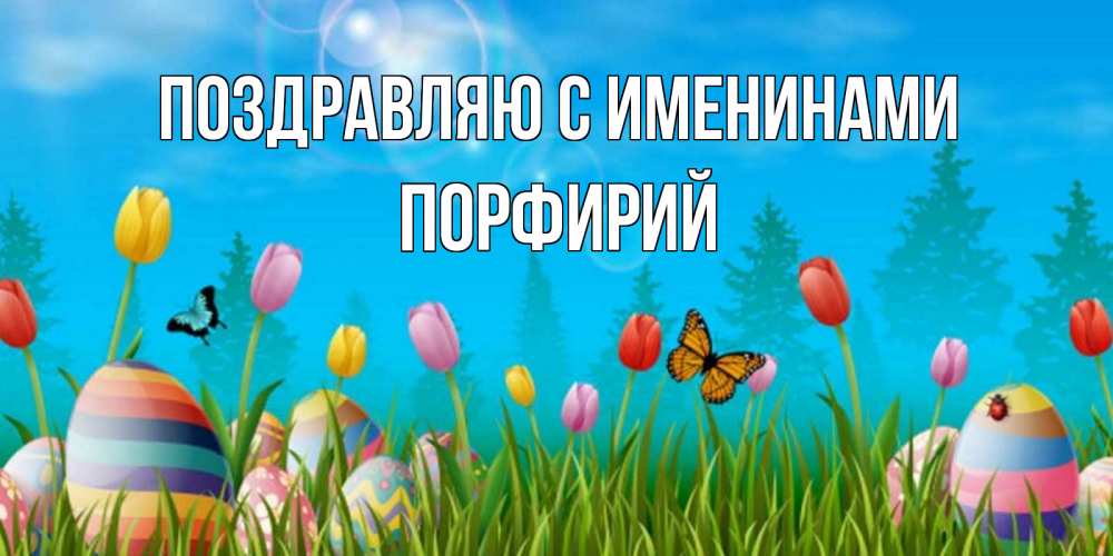 Открытка Поздравляю с именинами Порфирий. тюльпаны и радужные яйца. небо и тюльпаны с бабочкой