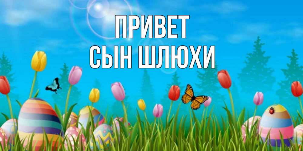 Открытка Привет Сын шлюхи. тюльпаны и радужные яйца. небо и тюльпаны с бабочкой