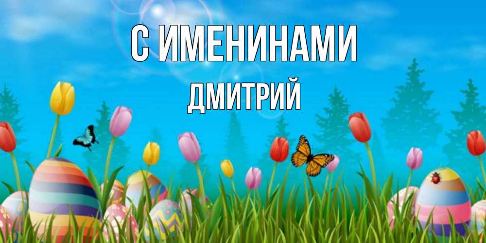 Открытка С именинами Дмитрий. тюльпаны и радужные яйца. небо и тюльпаны с бабочкой