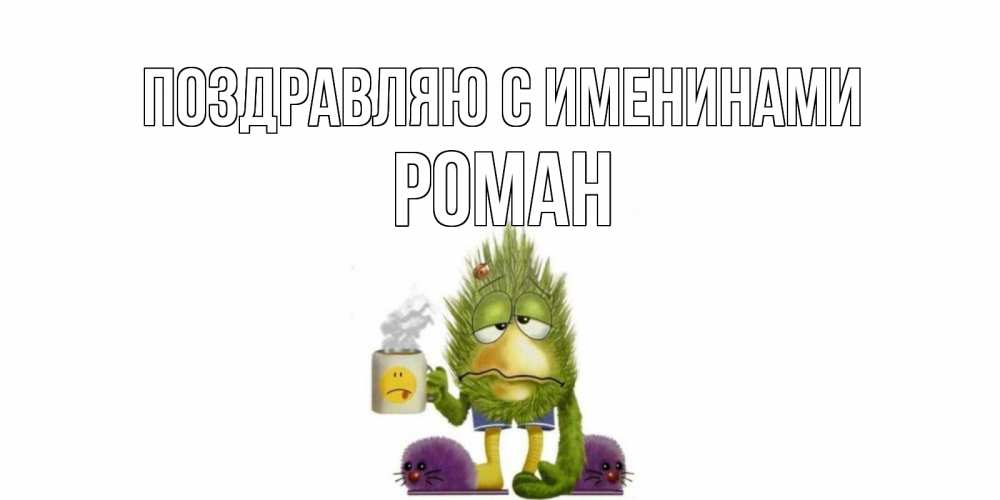 Открытка Поздравляю с именинами Роман. Монстрик с чаем желает не болеть. выздоравливайте быстрее