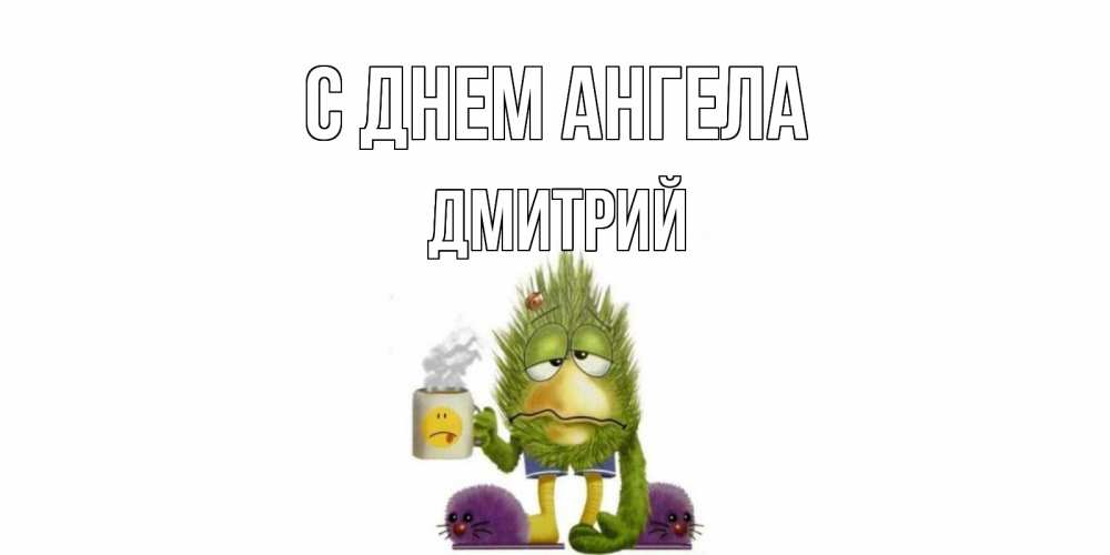 Открытка С днем Ангела Дмитрий. Монстрик с чаем желает не болеть. выздоравливайте быстрее