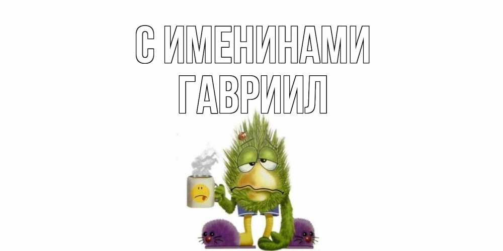Открытка С именинами Гавриил. Монстрик с чаем желает не болеть. выздоравливайте быстрее