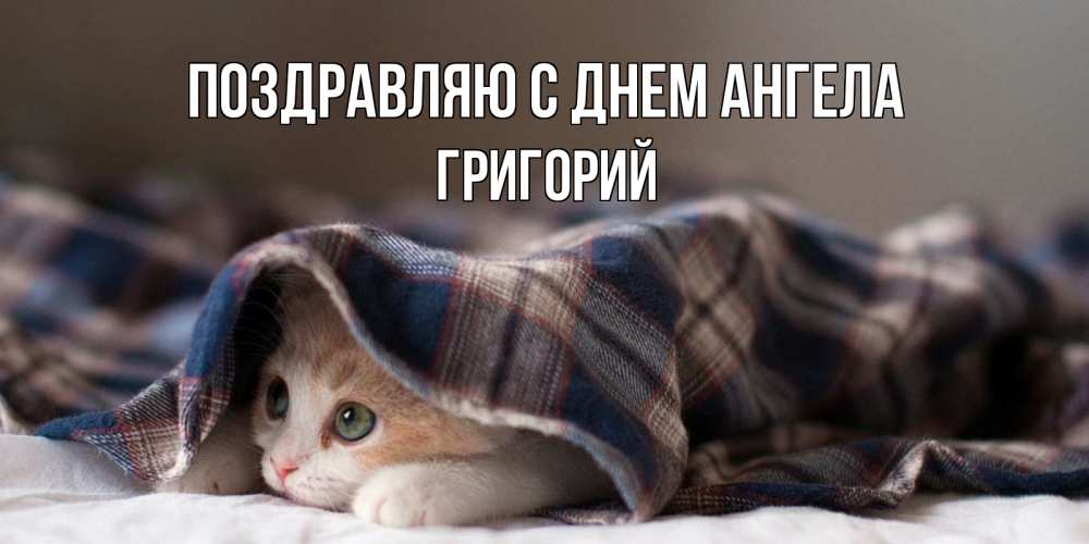Открытка Поздравляю с днем Ангела Григорий. котик под пледом желает скорейшего выздоровления. не болейте с котиком