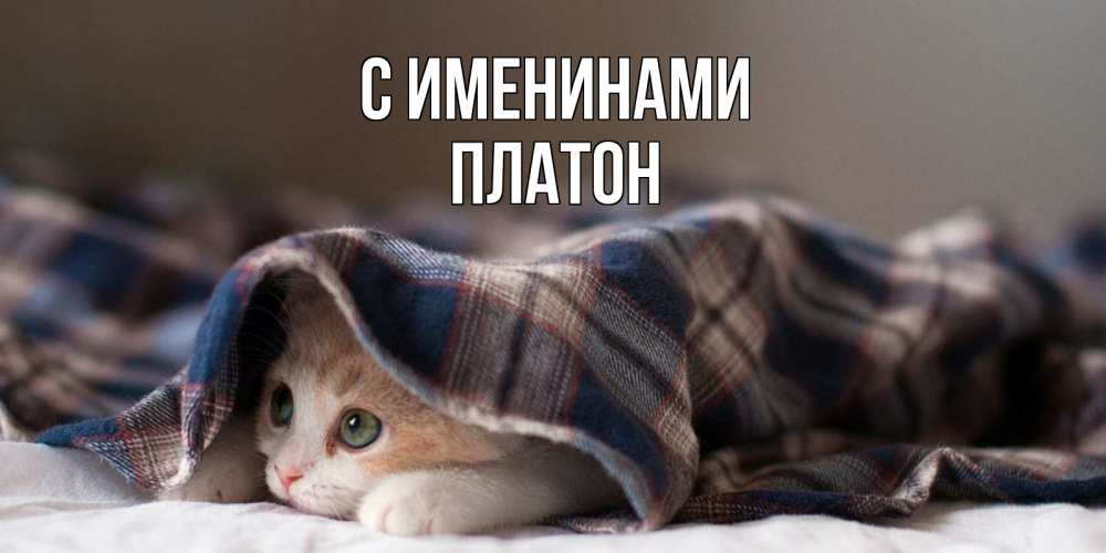 Открытка С именинами Платон. котик под пледом желает скорейшего выздоровления. не болейте с котиком