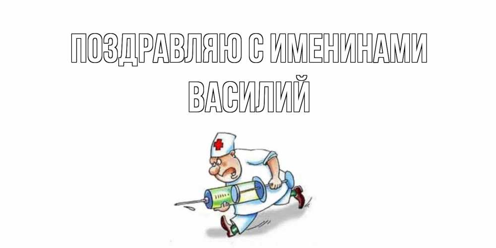 Открытка Поздравляю с именинами Василий. медсестра с большим шприцем желает не болеть. прикольные открытки не болей
