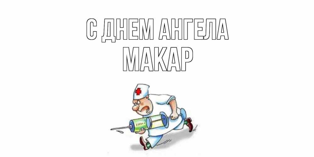 Открытка С днем Ангела Макар. медсестра с большим шприцем желает не болеть. прикольные открытки не болей