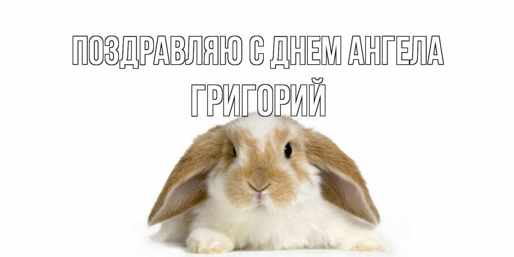 Открытка Поздравляю с днем Ангела Григорий. вислоухий кролик желает не болеть. вислоухий кролик белого и коричневого цвета