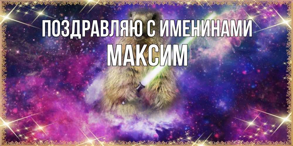 Открытка Поздравляю с именинами Максим. сурок джедай в космосе. спокойной ночи в стиле звездных войн