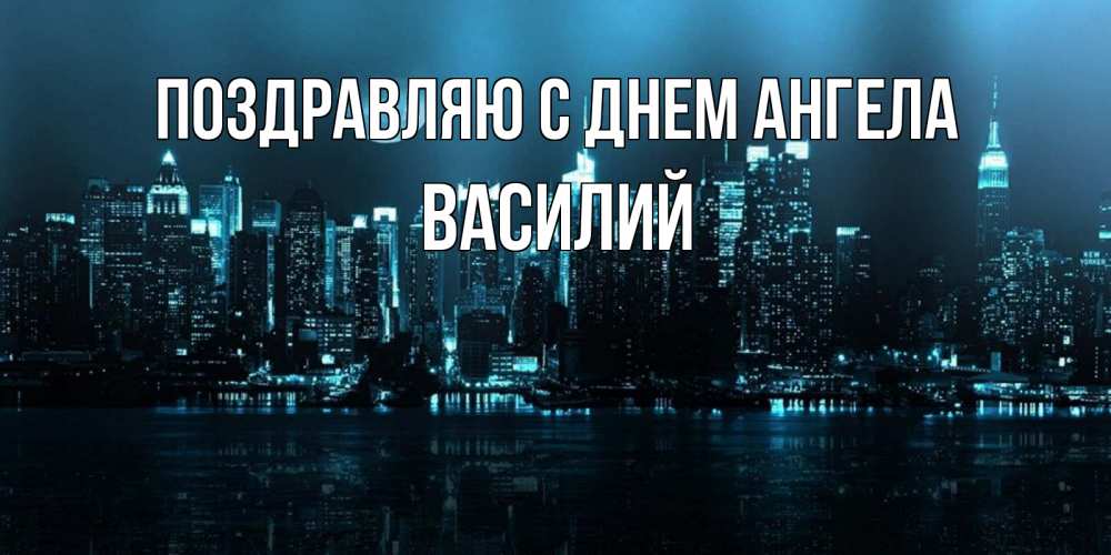 Открытка Поздравляю с днем Ангела Василий. ночной город и луна. городской пейзаж