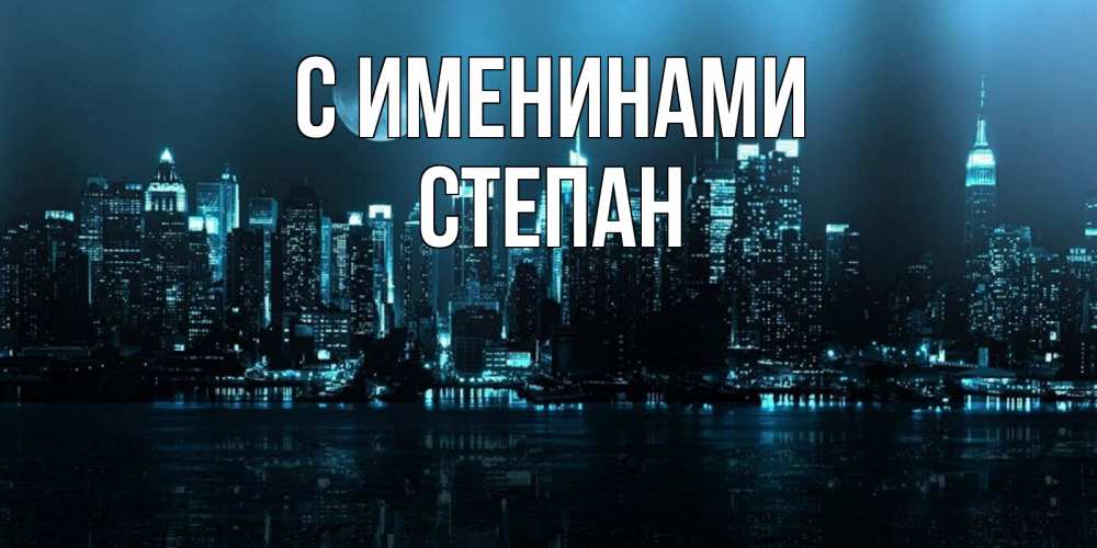 Открытка С именинами Степан. ночной город и луна. городской пейзаж