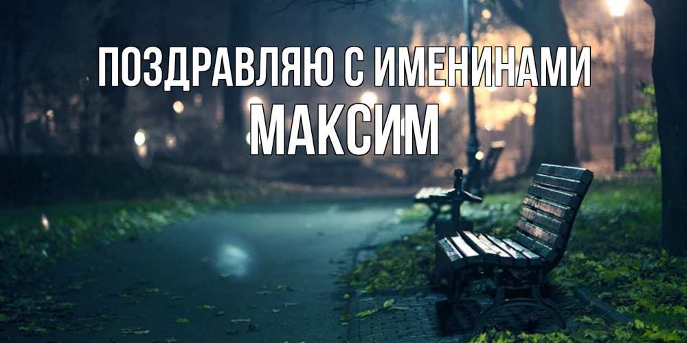 Открытка Поздравляю с именинами Максим. ночная улица с лавочкой. открытка для пожелания сладких снов
