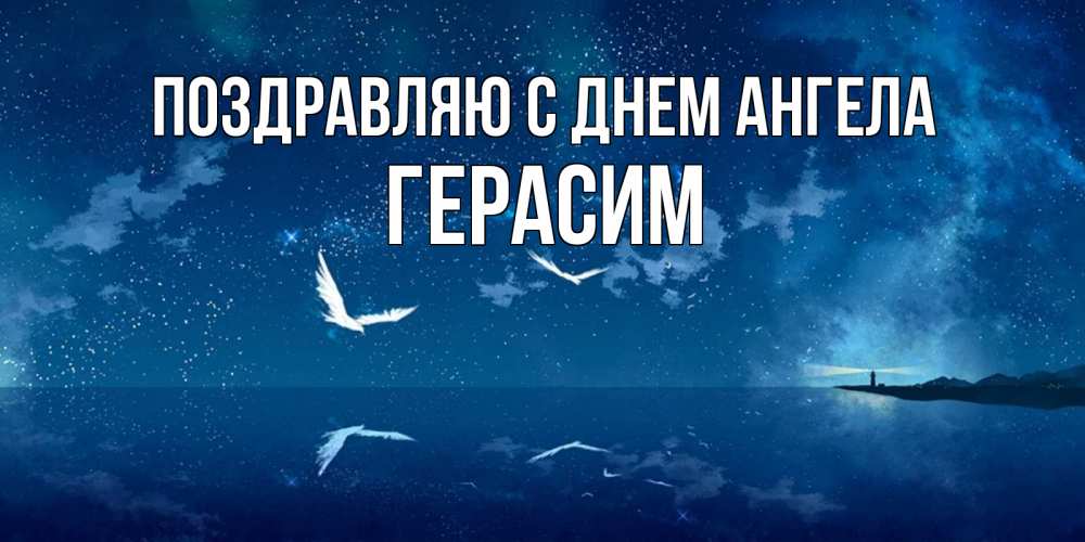 Открытка Поздравляю с днем Ангела Герасим. море маяк и фоны. птицы летят на фоне ночного неба