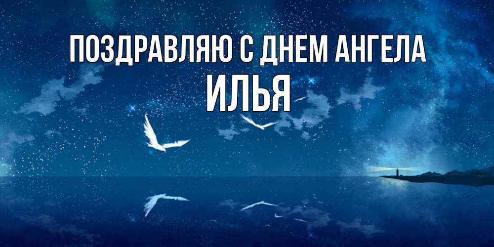 Открытка Поздравляю с днем Ангела Илья. море маяк и фоны. птицы летят на фоне ночного неба