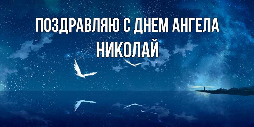 Открытка Поздравляю с днем Ангела Николай. море маяк и фоны. птицы летят на фоне ночного неба