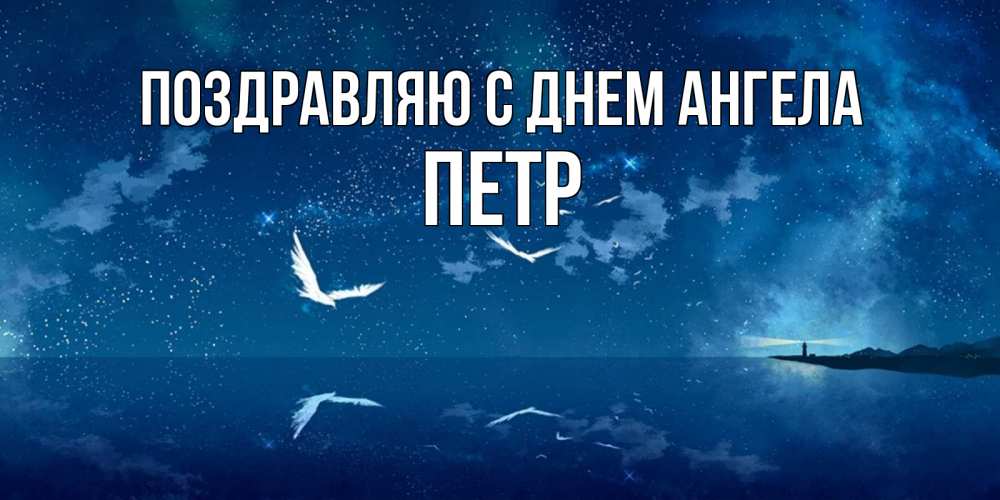 Открытка Поздравляю с днем Ангела Петр. море маяк и фоны. птицы летят на фоне ночного неба