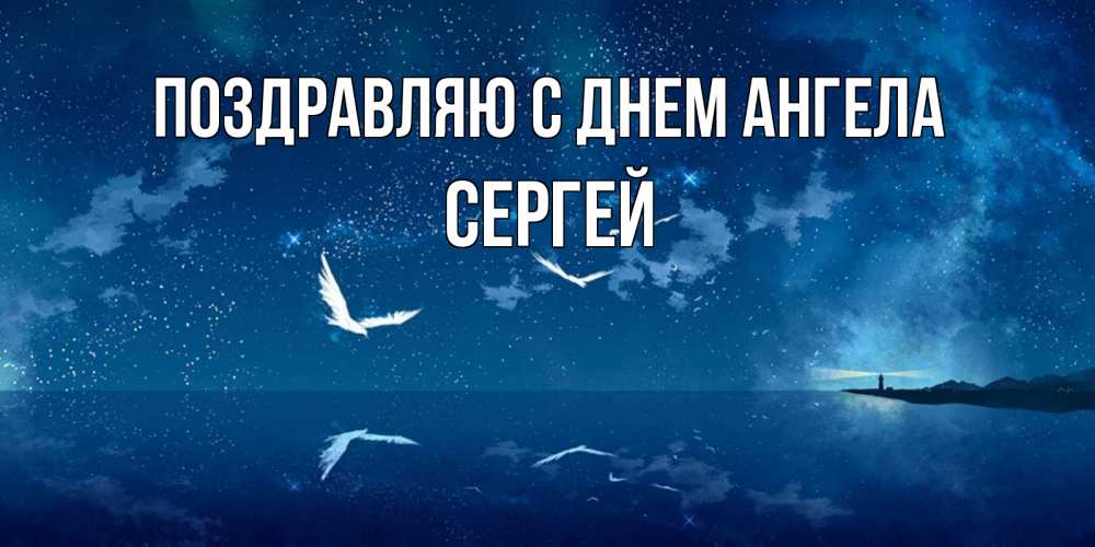 Открытка Поздравляю с днем Ангела Сергей. море маяк и фоны. птицы летят на фоне ночного неба