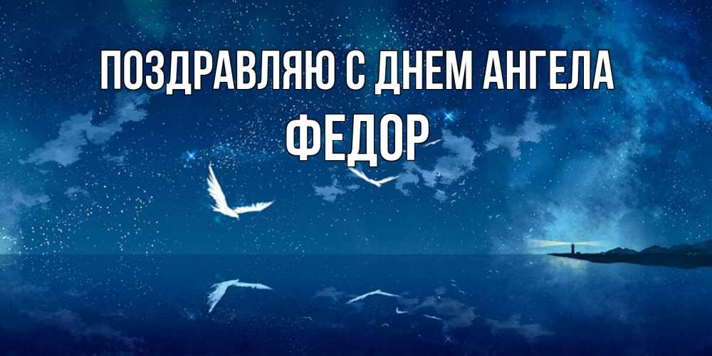 Открытка Поздравляю с днем Ангела Федор. море маяк и фоны. птицы летят на фоне ночного неба