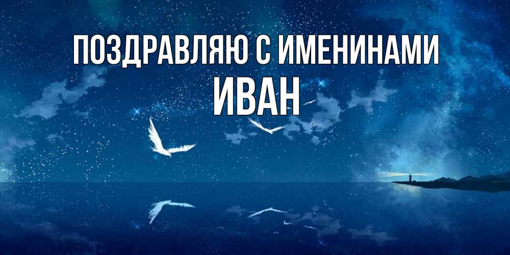 Открытка Поздравляю с именинами Иван. море маяк и фоны. птицы летят на фоне ночного неба