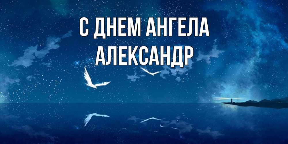 Открытка С днем Ангела Александр. море маяк и фоны. птицы летят на фоне ночного неба