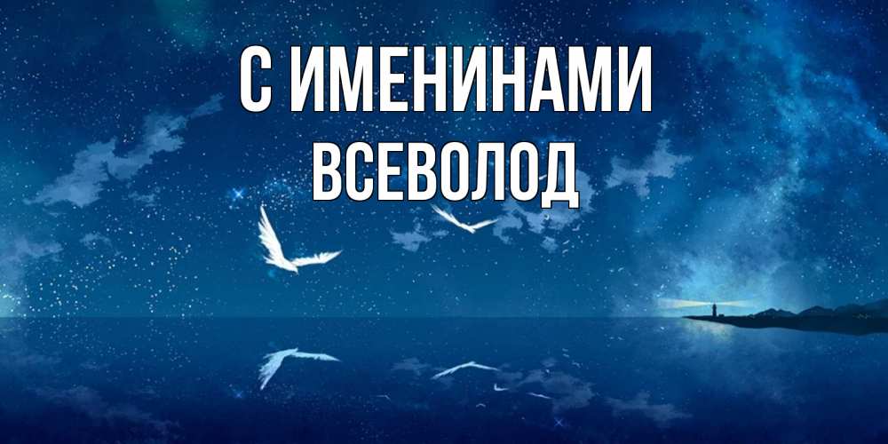 Открытка С именинами Всеволод. море маяк и фоны. птицы летят на фоне ночного неба