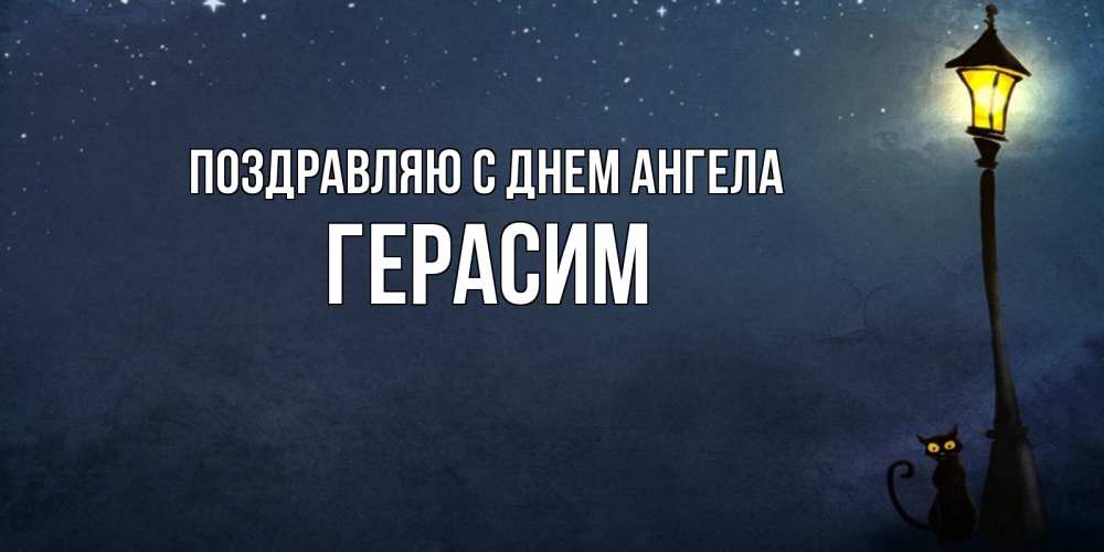 Открытка Поздравляю с днем Ангела Герасим. фонарь и ночь и котик. желтый фонарь на пустой улице