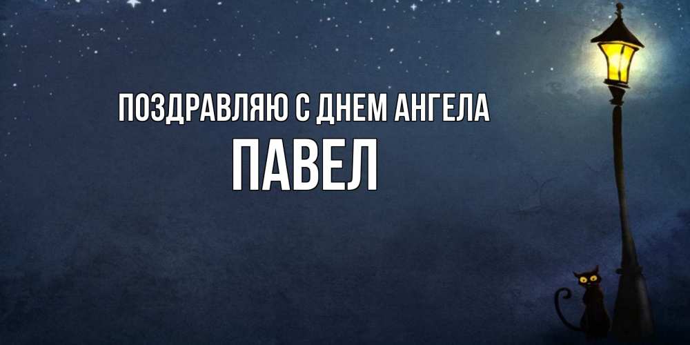 Открытка Поздравляю с днем Ангела Павел. фонарь и ночь и котик. желтый фонарь на пустой улице