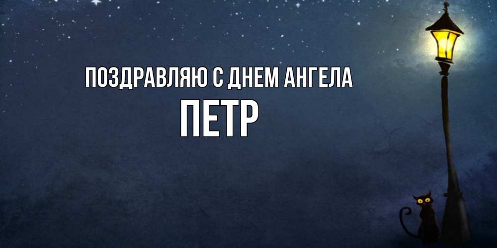 Открытка Поздравляю с днем Ангела Петр. фонарь и ночь и котик. желтый фонарь на пустой улице