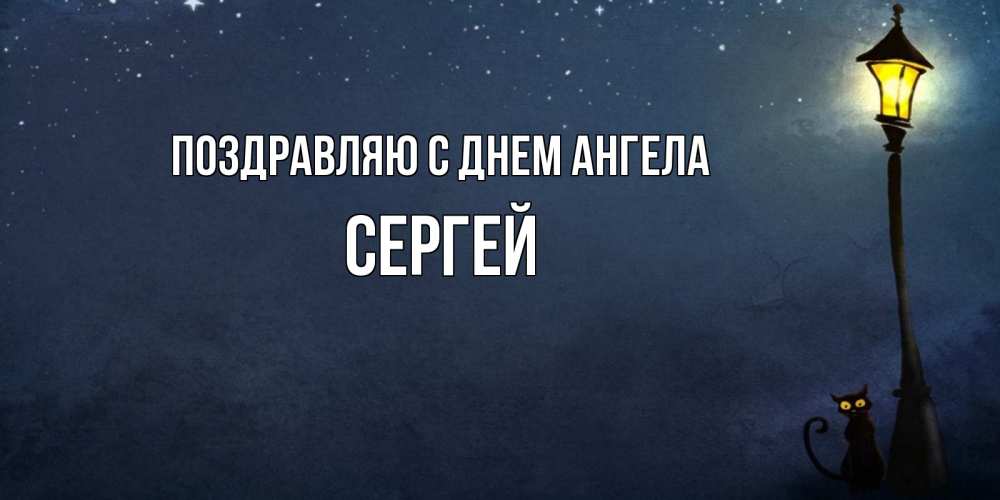 Открытка Поздравляю с днем Ангела Сергей. фонарь и ночь и котик. желтый фонарь на пустой улице