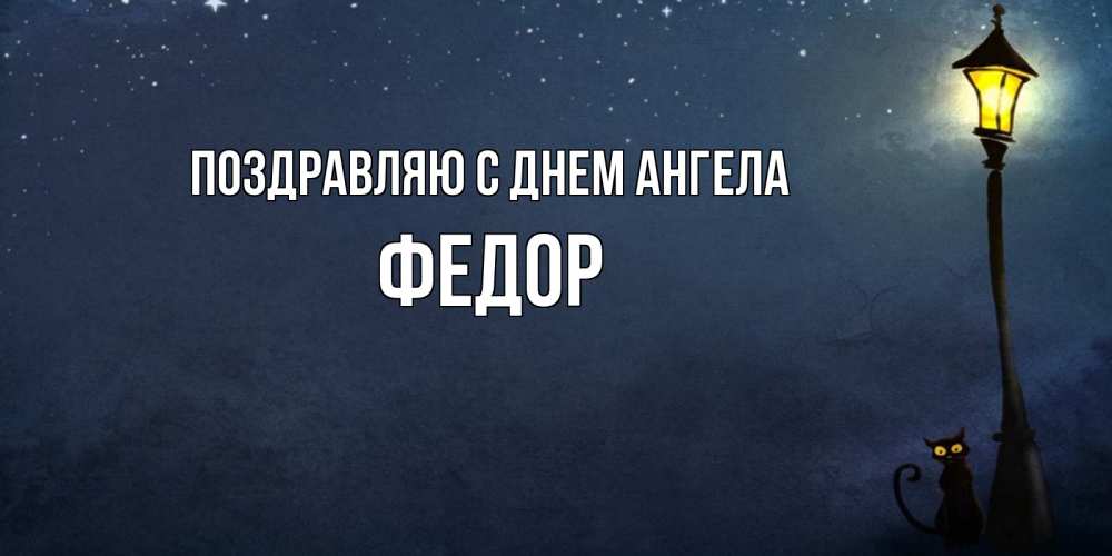Открытка Поздравляю с днем Ангела Федор. фонарь и ночь и котик. желтый фонарь на пустой улице