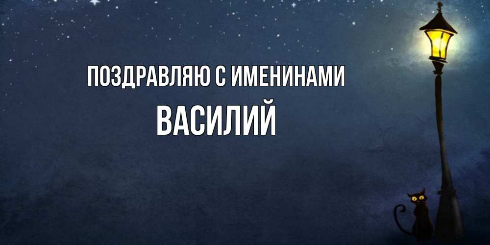Открытка Поздравляю с именинами Василий. фонарь и ночь и котик. желтый фонарь на пустой улице