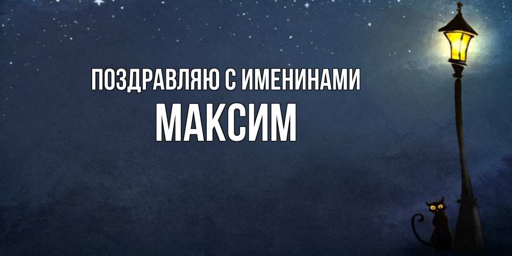 Открытка Поздравляю с именинами Максим. фонарь и ночь и котик. желтый фонарь на пустой улице