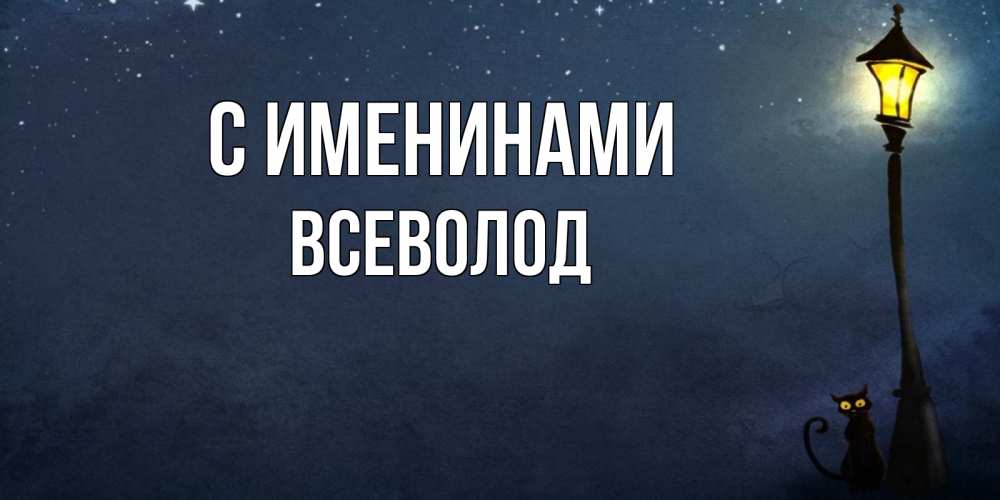 Открытка С именинами Всеволод. фонарь и ночь и котик. желтый фонарь на пустой улице