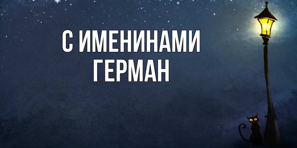Открытка С именинами Герман. фонарь и ночь и котик. желтый фонарь на пустой улице