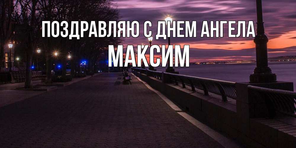 Открытка Поздравляю с днем Ангела Максим. ночная набережная. фонари на фоне реки