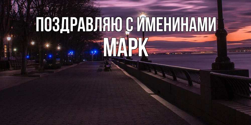 Открытка Поздравляю с именинами Марк. ночная набережная. фонари на фоне реки