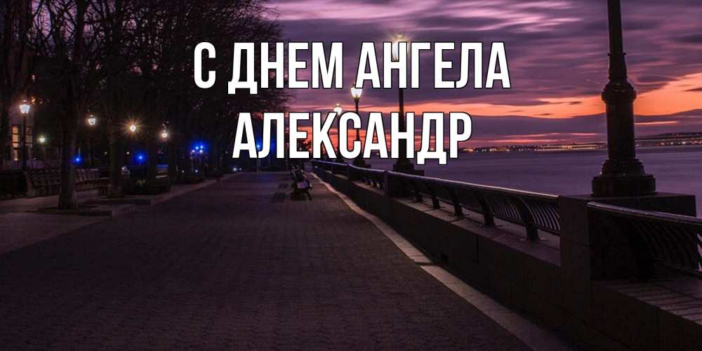 Открытка С днем Ангела Александр. ночная набережная. фонари на фоне реки