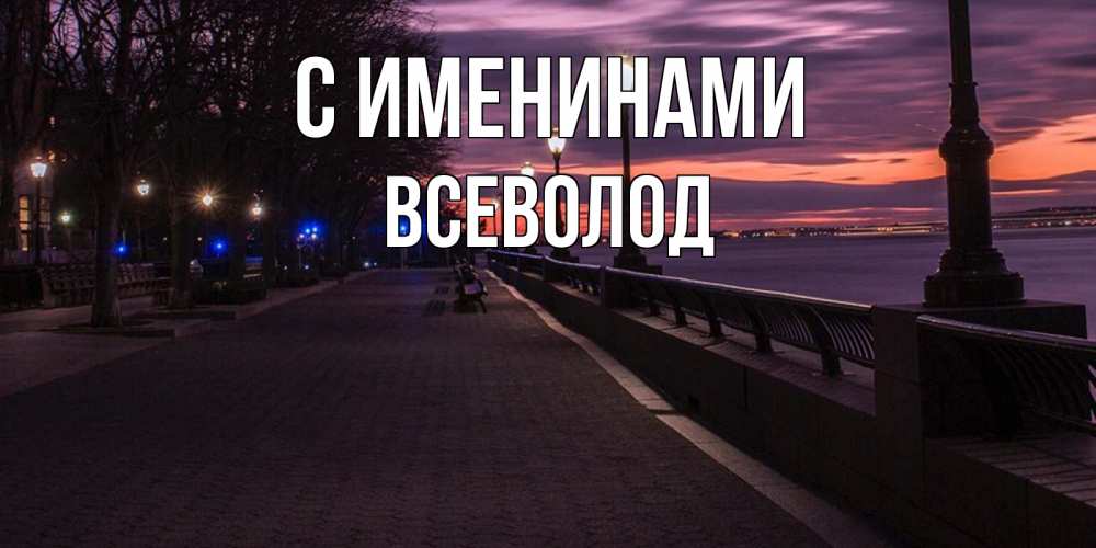 Открытка С именинами Всеволод. ночная набережная. фонари на фоне реки