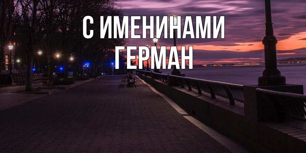 Открытка С именинами Герман. ночная набережная. фонари на фоне реки