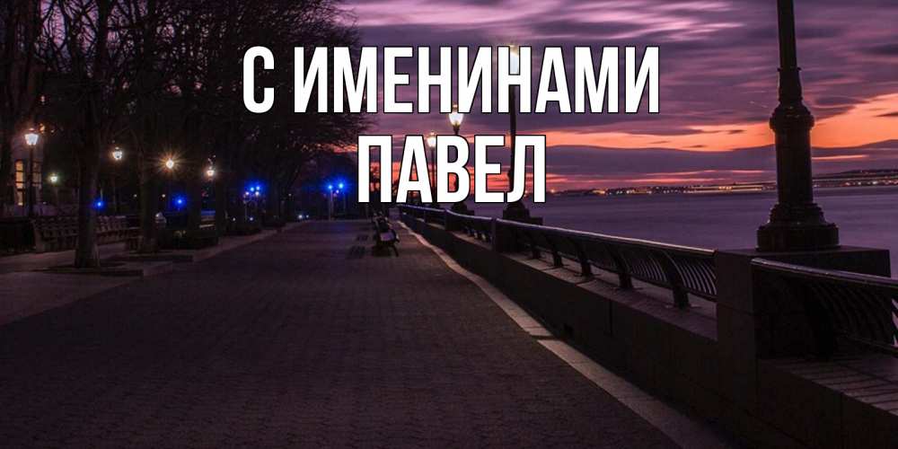 Открытка С именинами Павел. ночная набережная. фонари на фоне реки