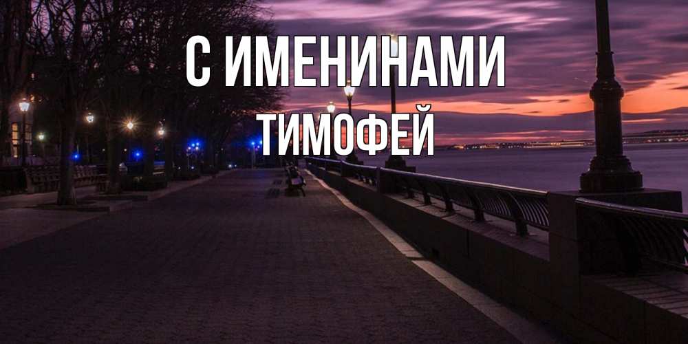 Открытка С именинами Тимофей. ночная набережная. фонари на фоне реки