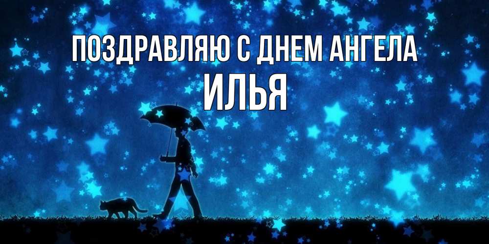 Открытка Поздравляю с днем Ангела Илья. прогулка под зонтом. ночные прогулки с котом под звездами