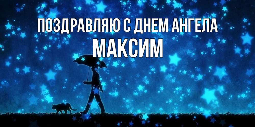 Открытка Поздравляю с днем Ангела Максим. прогулка под зонтом. ночные прогулки с котом под звездами